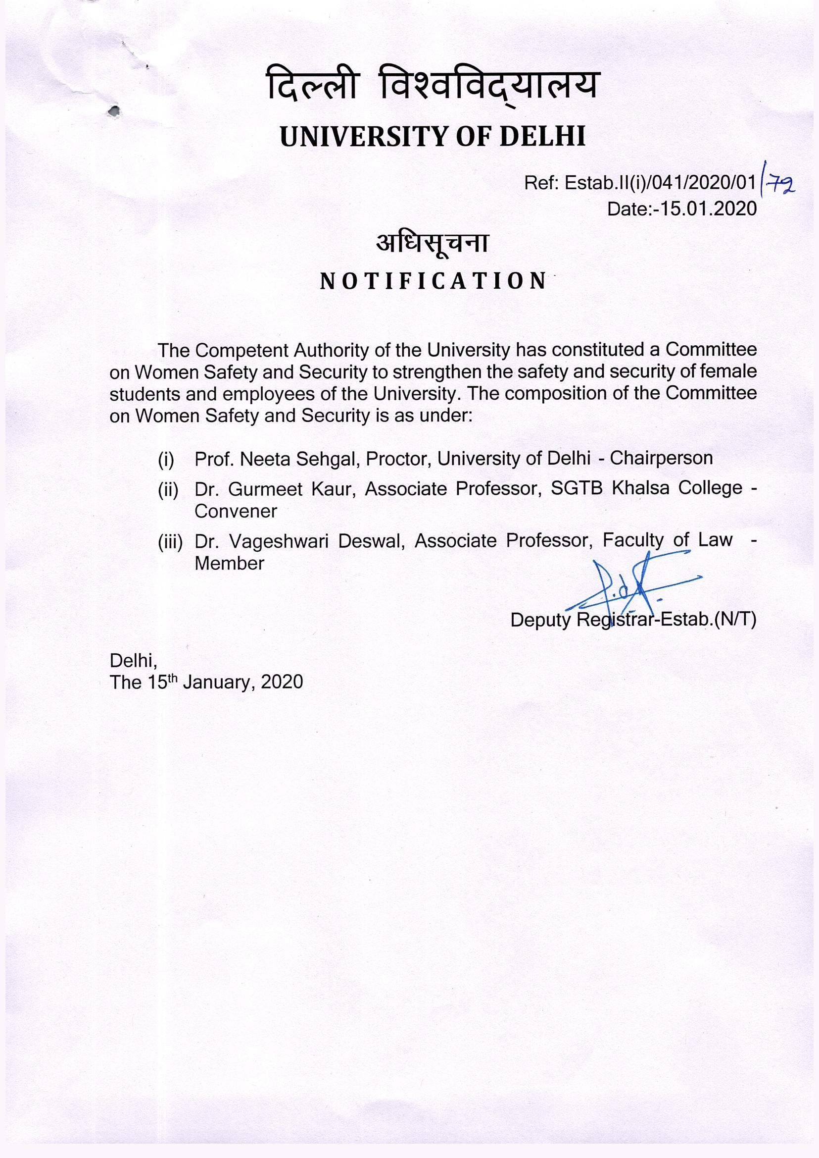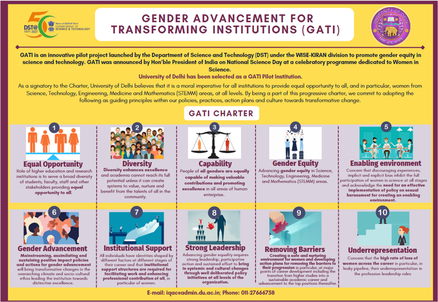 University of Delhi promotes equal opportunities for all genders in all domains – academic and administrative. University of Delhi also endorses practices and policies that are confirming of the internationally adopted United Nation’s Sustainable Development Goals (SDG 5, Gender Equality). The ecosystem at University of Delhi has always been inclusive of the gender diversity, encourages effective participation and equal opportunities for everyone. It also aspires to create an enabling environment for equal participation of women in Science, Technology, Engineering, and Mathematics (STEM) at all levels, addressing the gender-gap in STEM disciplines.